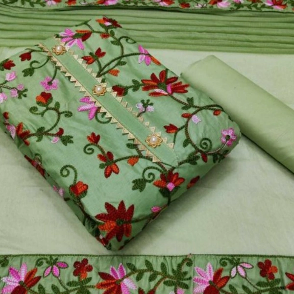 Jivika Graceful Salwar Suits & Dress Materials Top Fabric: Cotton + Top Length: 2.2 Meters Bottom Fabric: Cotton + Bottom Length: 2 Meters Dupatta Fabric: Chiffon + Dupatta Length: 2.2 Meters Lining Fabric: Cotton Type: Un Stitched Pattern: Embroidered Multipack: Single Country of Origin: India