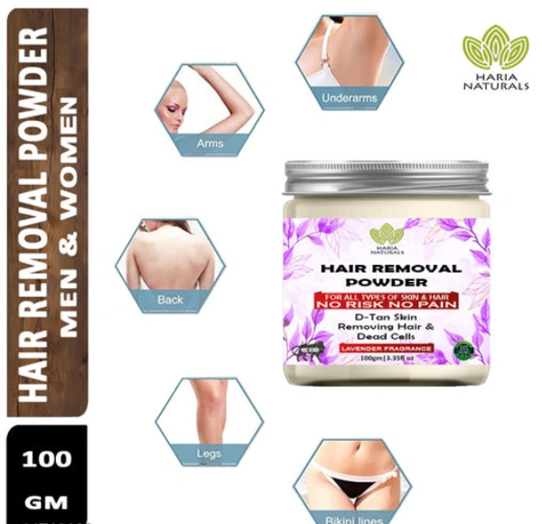 Product Name : Haria Naturals Hair Removal Powder (Lavender Fragrance) For Underarms, Hand, Legs & Bikini Line Three in one Use For D-Tan Skin, Removing Hair, Remove Dead cell (For Easy Hair Removal No Risk No Pain) Men & Women 100 gms