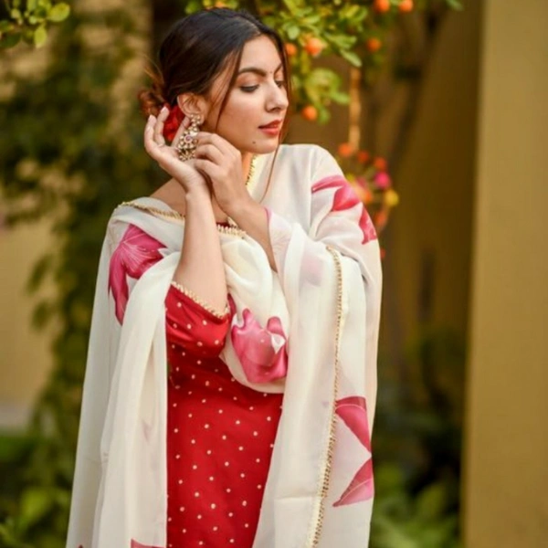 M (Bust Size: 38 in, Shoulder Size: 14.5 in, Kurta Waist Size: 38 in, Kurta Hip Size: 39 in, Kurta Length Size: 38 in, Bottom Waist Size: 30 in, Bottom Hip Size: 31 in, Bottom Length Size: 38 in, Duppatta Length Size: 1.9 m)