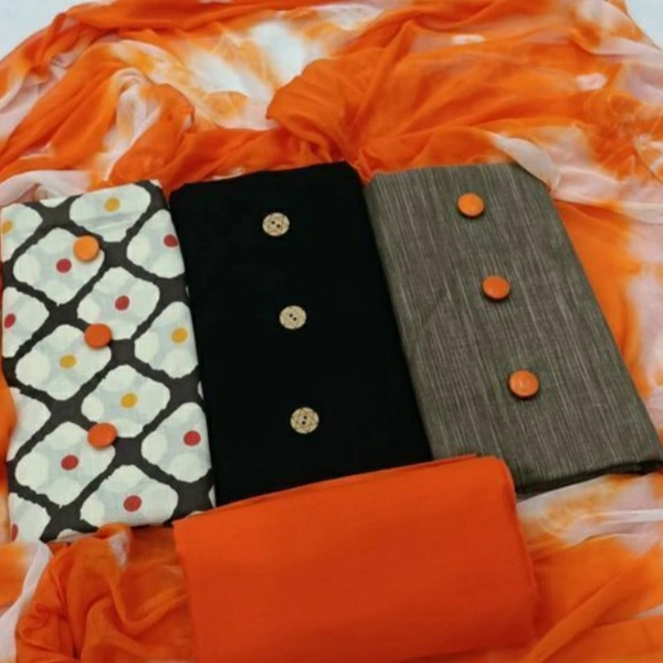 Elegant Cotton Suit Top Fabric: Cotton + Top Length: 2 Meters Bottom Fabric: Cotton + Bottom Length: 2.25 Meters Dupatta Fabric: Chiffon + Dupatta Length: 2.25 Meters Lining Fabric: No Lining Type: Un Stitched Pattern: Printed Multipack: 3 Top Country of Origin: India