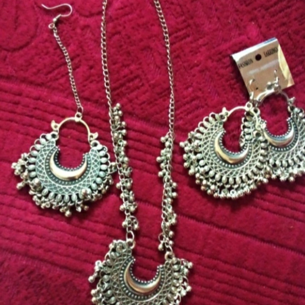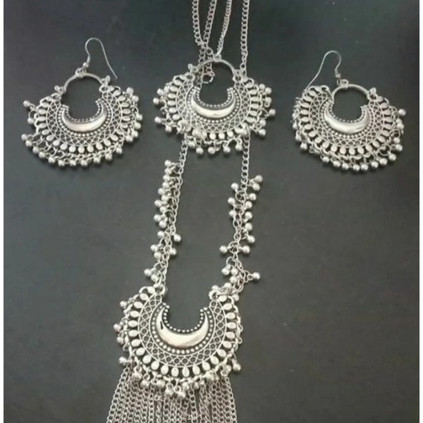 Latest Women's Jewellery Sets Base Metal: Alloy Plating: Oxidised Silver Stone Type: Artificial Stones Sizing: Adjustable Type: Necklace Earrings Maangtika Multipack: 1 Country of Origin: India
