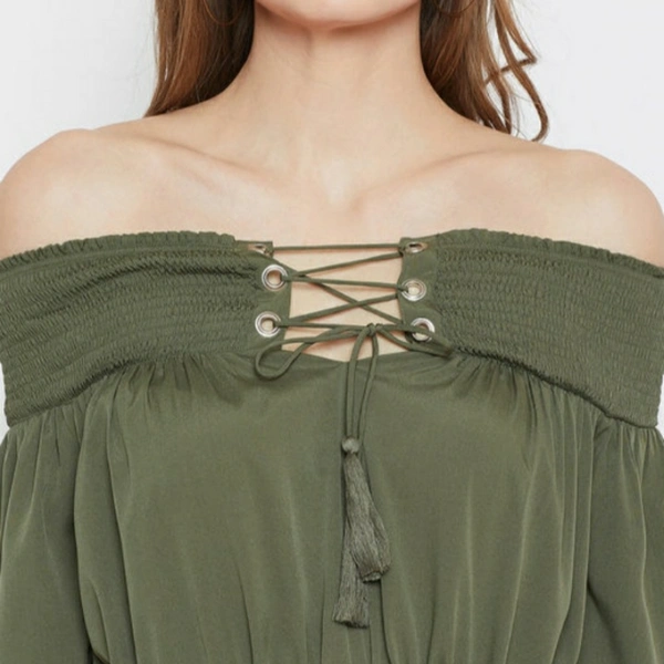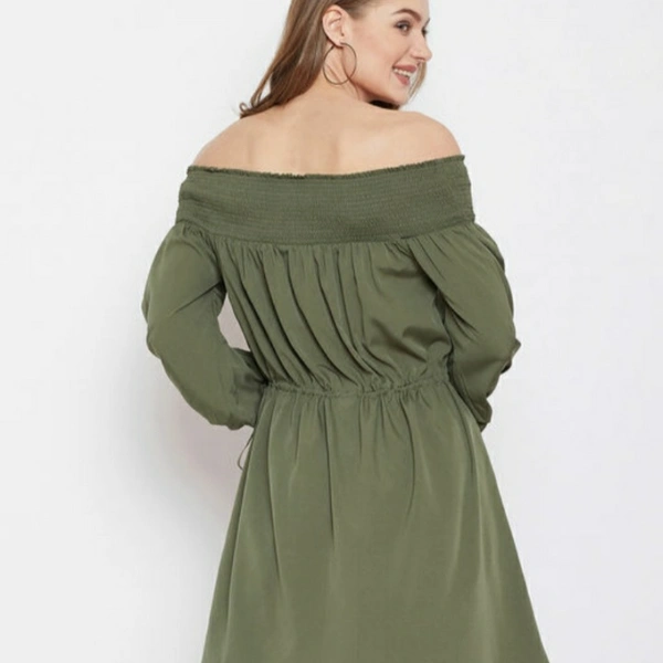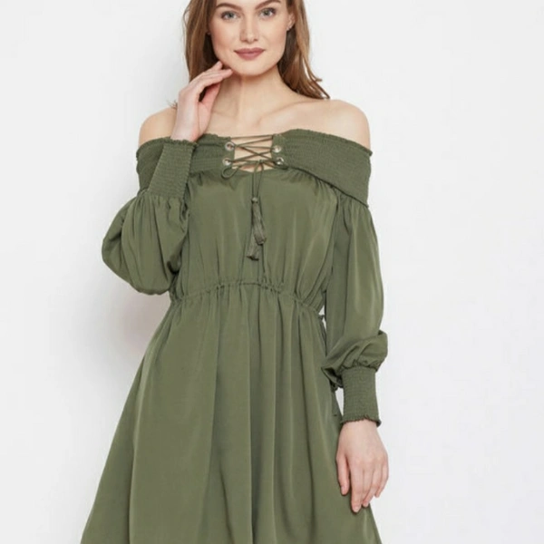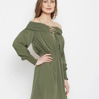 PANIT Women Olive Solid Blouson Dress Fabric: Polyester Sleeve Length: Long Sleeves Pattern: Solid Multipack: 1 Sizes: S (Bust Size: 34 in, Length Size: 32 in) XL (Bust Size: 40 in, Length Size: 32 in) L (Bust Size: 38 in, Length Size: 32 in) M (Bust Size: 36 in, Length Size: 32 in) XXL (Bust Size: 42 in, Length Size: 33 in) Solid olive bohemian look A-line mini crepe Dress has off shoulder,full length bishopes sleevess, smocked cuffs, tieup detail at waist and flared hem. Country of Origin: India
