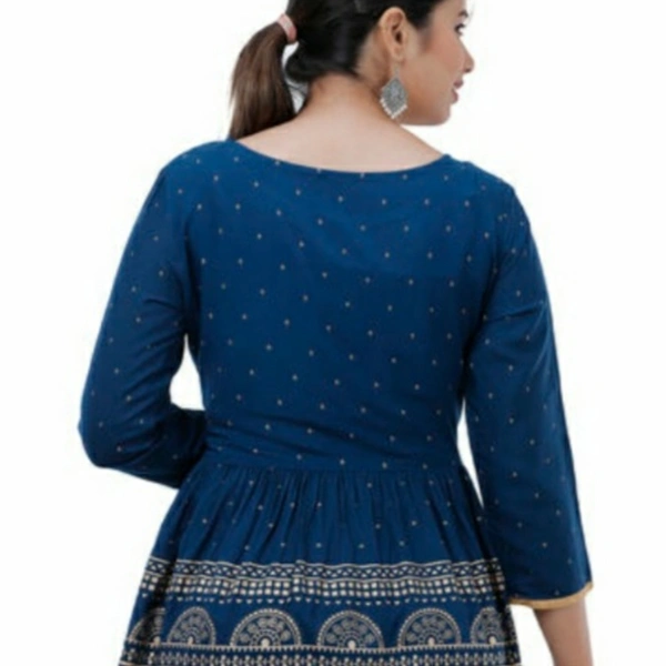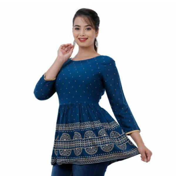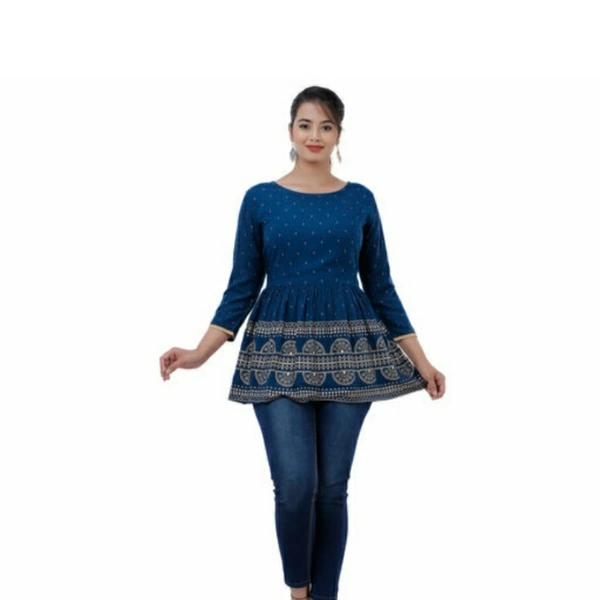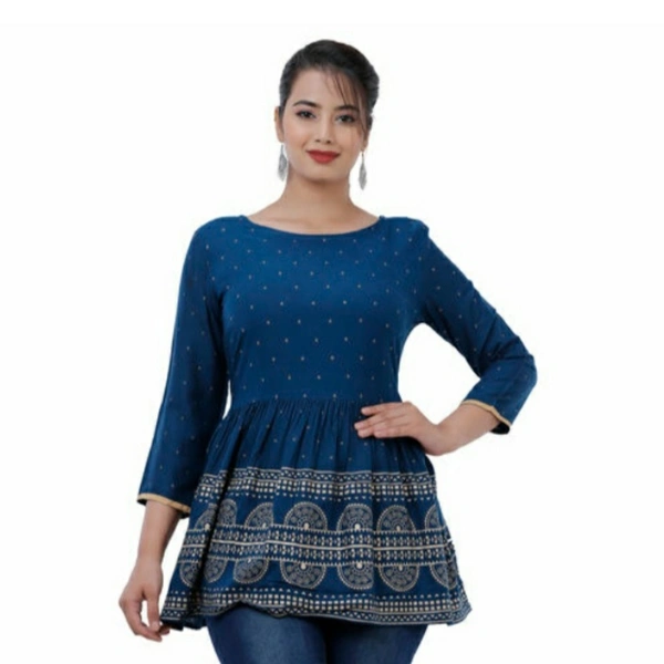 Rayon Printed Regular Top Fabric: Rayon Sleeve Length: Three-Quarter Sleeves Pattern: Printed Multipack: 1 Sizes: S (Bust Size: 36 in) XL (Bust Size: 42 in) L (Bust Size: 40 in) M (Bust Size: 38 in) XXL (Bust Size: 44 in) Country of Origin: India