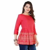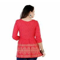 Rayon Printed Regular Top Fabric: Rayon Sleeve Length: Three-Quarter Sleeves Pattern: Printed Multipack: 1 Sizes: S (Bust Size: 36 in) XL (Bust Size: 42 in) L (Bust Size: 40 in) M (Bust Size: 38 in) XXL (Bust Size: 44 in) Country of Origin: India