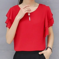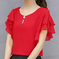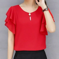Women red Ruffle Sleeve Neck Button Top Fabric: Georgette Sleeve Length: Short Sleeves Pattern: Solid Multipack: 1 Sizes: S (Bust Size: 36 in) XL (Bust Size: 42 in) L (Bust Size: 40 in) M (Bust Size: 38 in) Country of Origin: India
