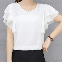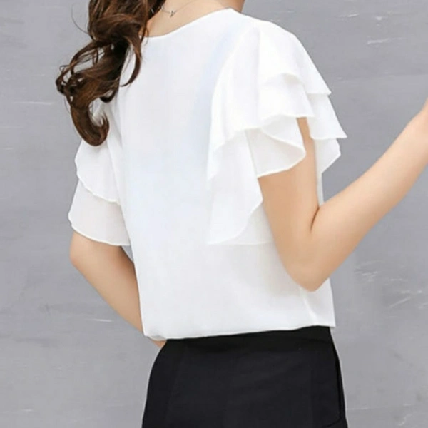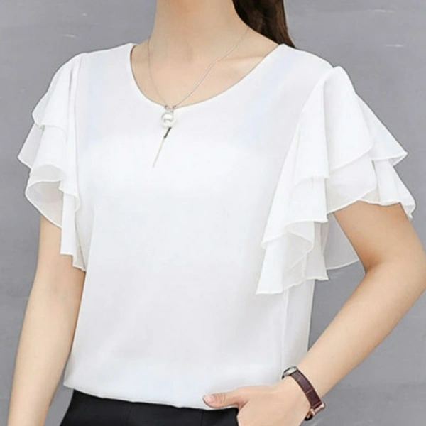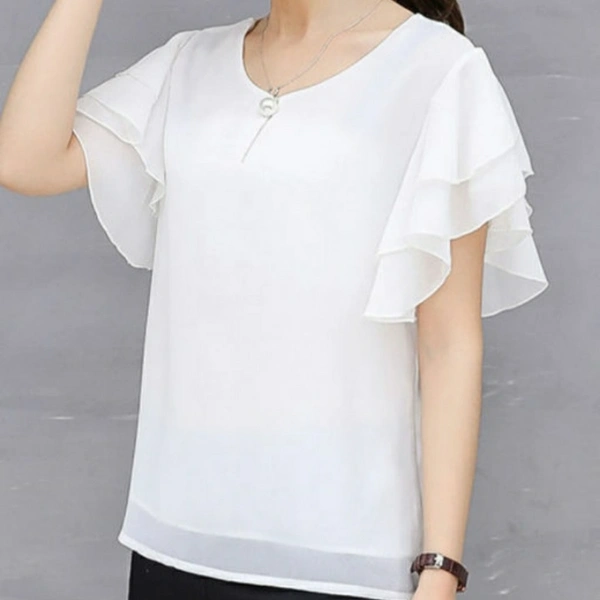 Women Pink Ruffle Sleeve Neck Button Top Fabric: Georgette Sleeve Length: Short Sleeves Pattern: Solid Multipack: 1 Sizes: S (Bust Size: 36 in) XL (Bust Size: 42 in) L (Bust Size: 40 in) M (Bust Size: 38 in) Country of Origin: India